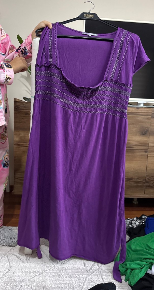 Bu bol kesim, kolsuz hamile tunik, tekne yaka ve drapeli detaylara sahip. Nakışlı desenlerle süslü, yumuşak sentetik kumaştan yapılmış, koyu mor renkte bohem tarz sunar, günlük kullanım için uygundur.