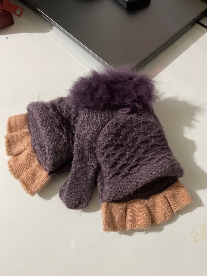 Mor örgü kadın eldivenleri, bohem tarzda, tüylü manşet ve bej parmak ucu kısmıyla sıcak ve şık bir görünüm sunar.