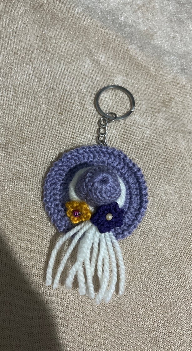 Mor tığ işi şapka, renkli çiçek süslemeleri ve beyaz püsküllerle bohem tarzda anahtarlık. Anahtarlarınıza retro bir dokunuş katıyor.