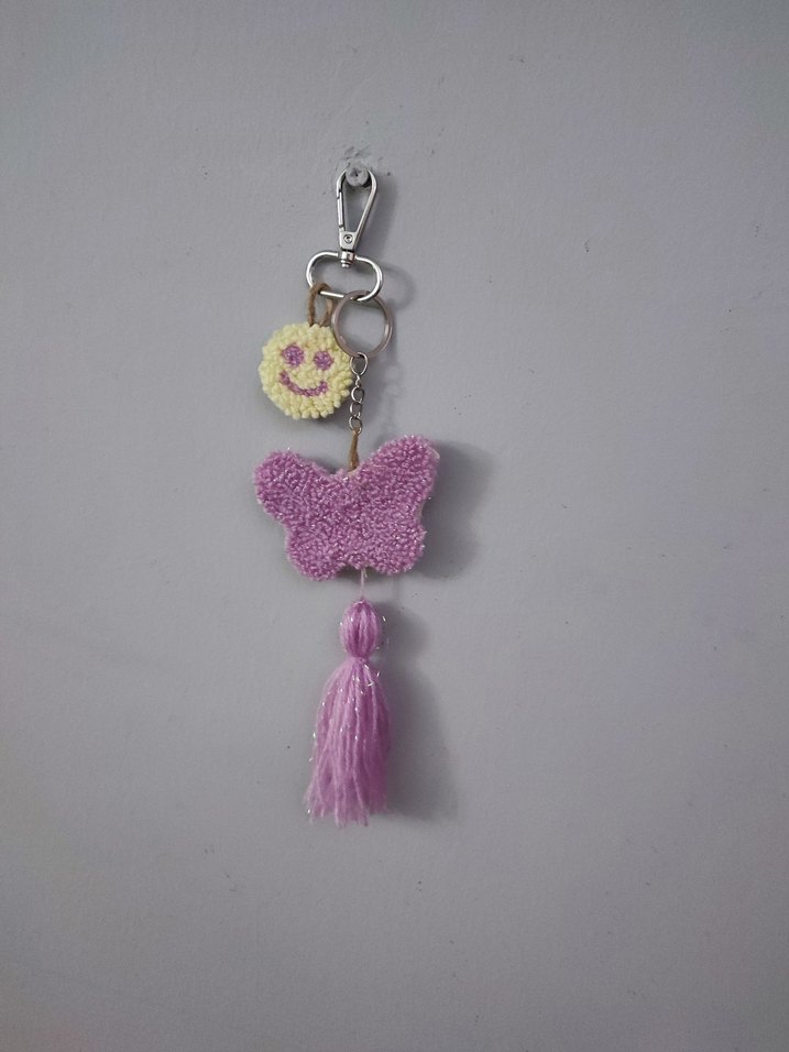 Bohem ruhu yansıtan bu özel tasarım anahtarlık & çanta charmı, mor kelebek ve gülen yüz figürüyle enerjik ve özgün bir stil sunar. Renkli püskül detayları ve hafif yansımalı ışıltıları sayesinde gün ışığında zarif bir parıltı kazanır. Hem anahtarlık olarak hem de çantalarınıza karakter katacak bir aksesuar olarak kullanabilirsiniz. ✨ İstediğiniz renk ve model seçenekleri için benimle iletişime geçebilirsiniz. El emeği, sınırlı üretim