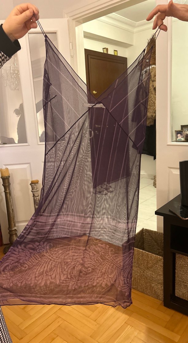 Bohem tarzda, koyu mor renkte, hafif ve transparan kumaştan yapılmış
