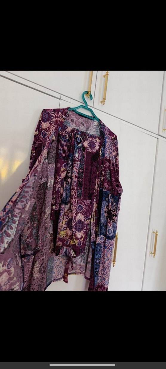 Mor renkte, uzun kollu ve V yakalı, bol kesim kumaştan yapılmış uzun bir kimono. Koyu tonlu batik desenleri ve dökümlü tasarımı bohem tarzını yansıtıyor.
