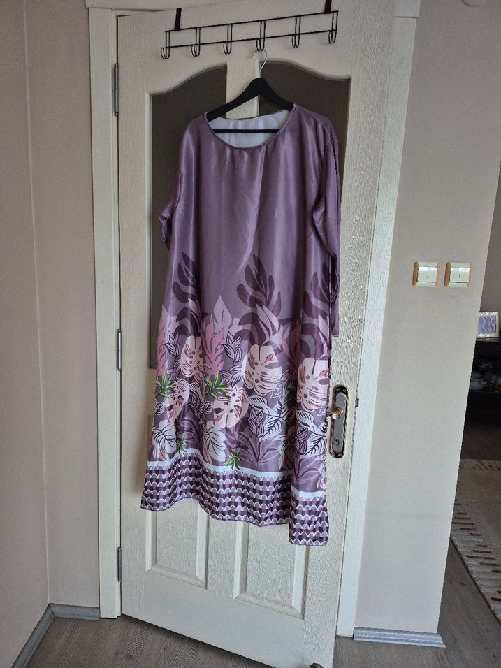 Bohem tarzda, uzun kollu ve salaş kesim mor ve gri tonlarında, dökümlü, bağlama desenli uzun elbise. Günlük kullanıma uygundur.