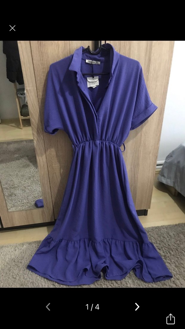 Mor keten kumaştan, v yaka ve kısa kollu, bol kesim uzun elbise. Dökümlü ve pastel tonuyla bohem stilini yansıtır.