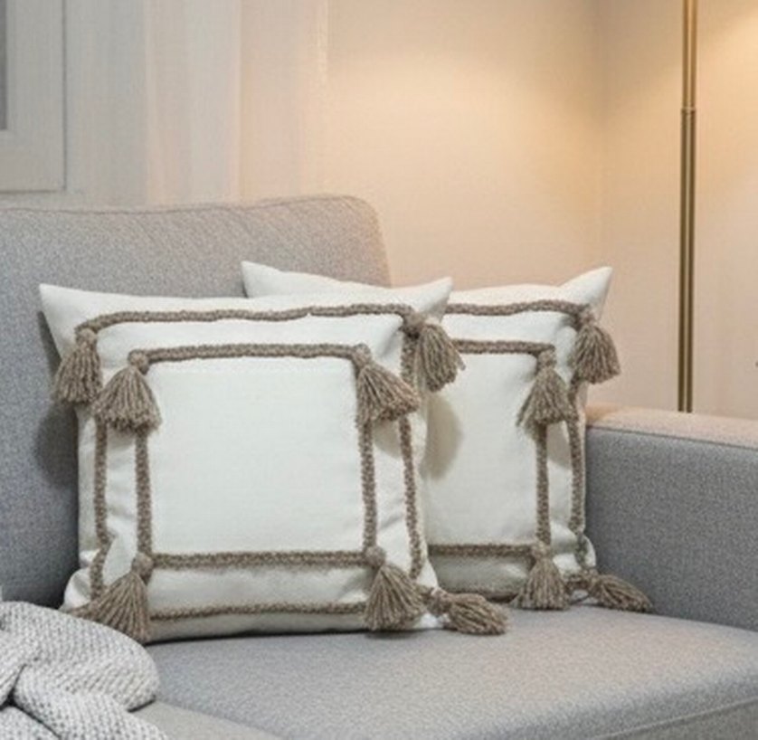 Bej renkte, gri nakışlı püskül detaylı bohem tarzı kırlentler, her oturma alanına sıcak ve dekoratif bir dokunuş sağlar. ️