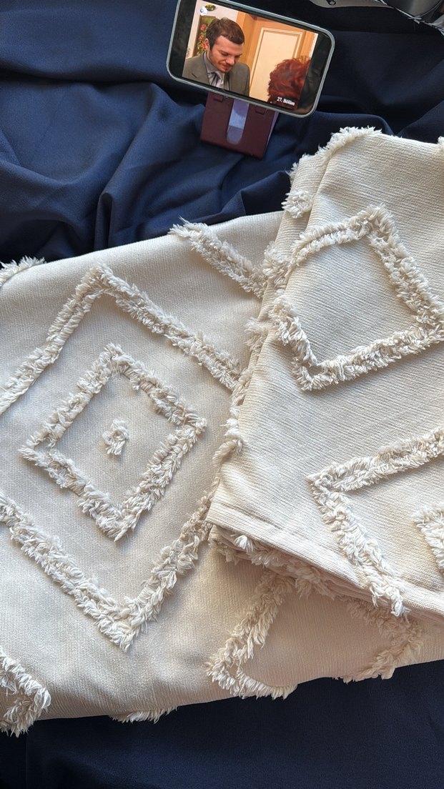 Bohem tarzda beyaz zemin üzerine gri nakışlı geometrik desenler ve dokulu püsküller bulunan kırlent kılıfı. Yumuşak ve dekoratif kumaş, rahat ortamlar için ideal. ️