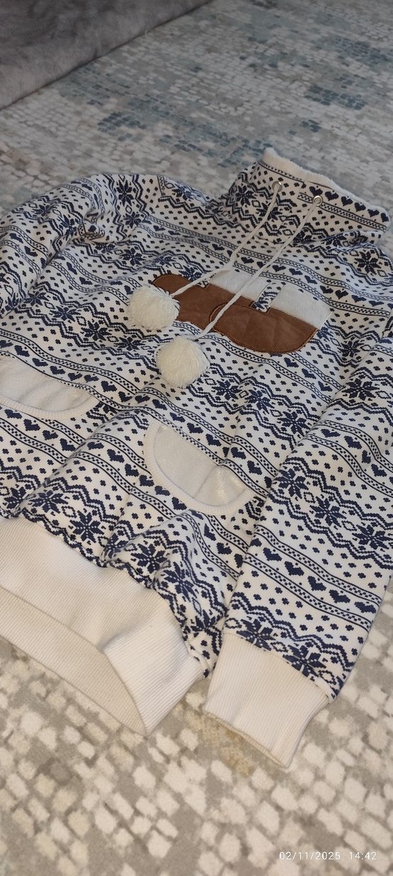 Bohem tarzda, beyaz ve gri nakışlı örgü kumaştan yapılmış, ponpon detaylı rahat kedi süveteri.