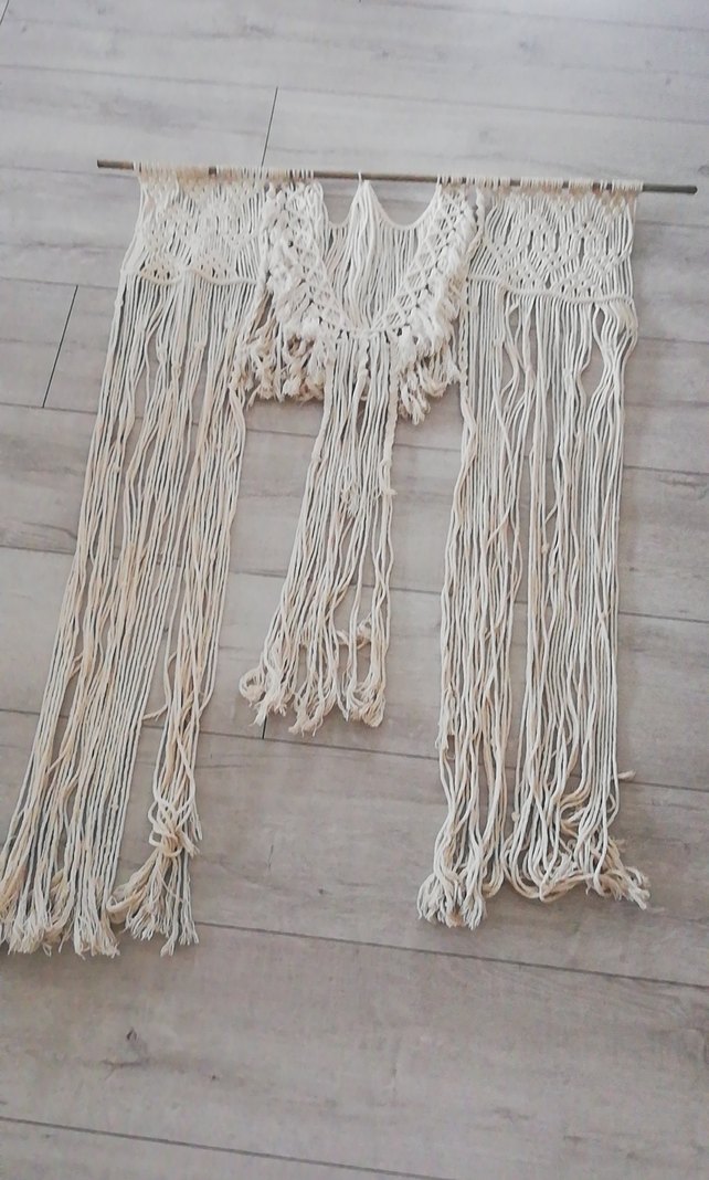 Bohem tarzı perde. 3ay kadar kullanılmayan balkonda kaldığı için aşırı kirli, bilerek alım yapın. Sopasını çıkarıp yıkarsam formunu ilmeklerini kaybederim diye yıkamadım. Yada sopasıyla bekletip durulanır. Krem renk.