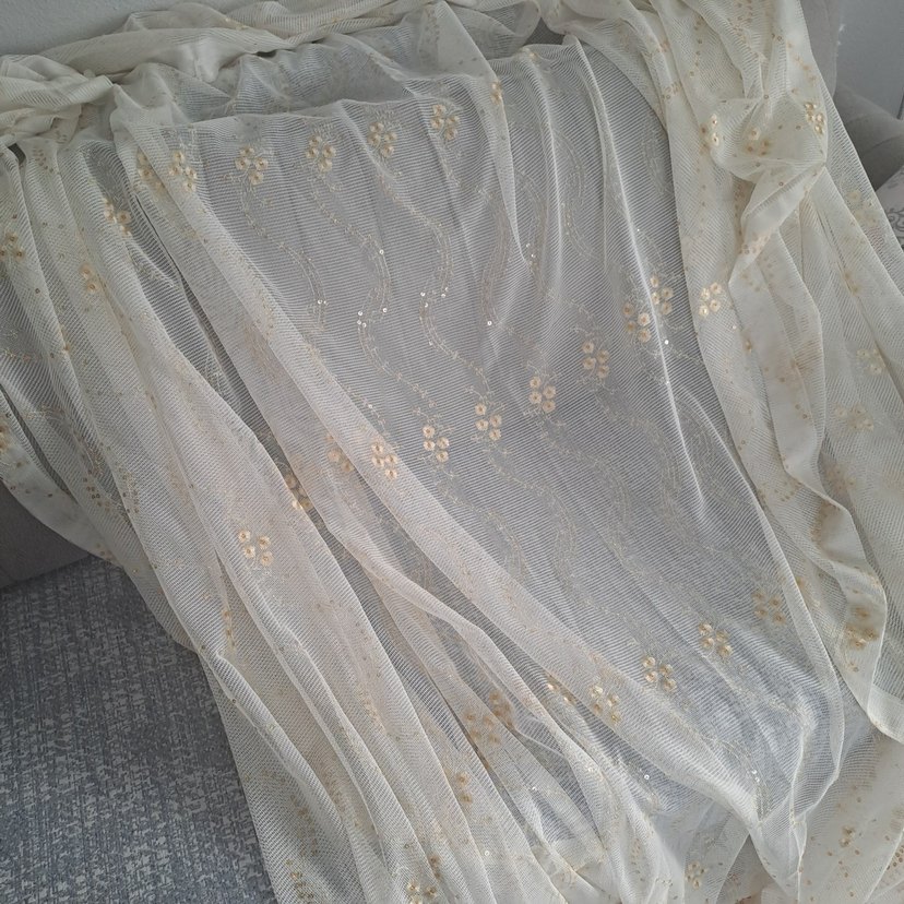 Hafif bohem tarzda, beyaz tül üzerine ince nakışlı çiçek desenleri bulunan yumuşak ve hafif bir perde. eni 270 boy 250 iki adet yeni gibi hiç bir deforme yoktur