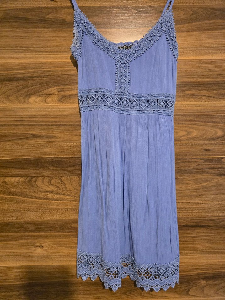 Dantel detaylı, nakışlı ve V yakalı, bohem tarzda, ince askılı, rahat kesim uzun elbise. Yumuşak kumaştan, pastel mavi renkte, günlük kullanıma uygundur.