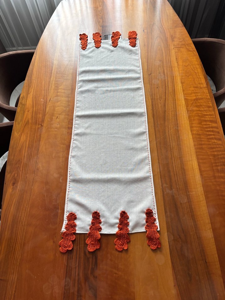Bohem tarzda, yumuşak gri beyaz kumaş üzerinde turuncu nakış detayları bulunan masa örtüsü.