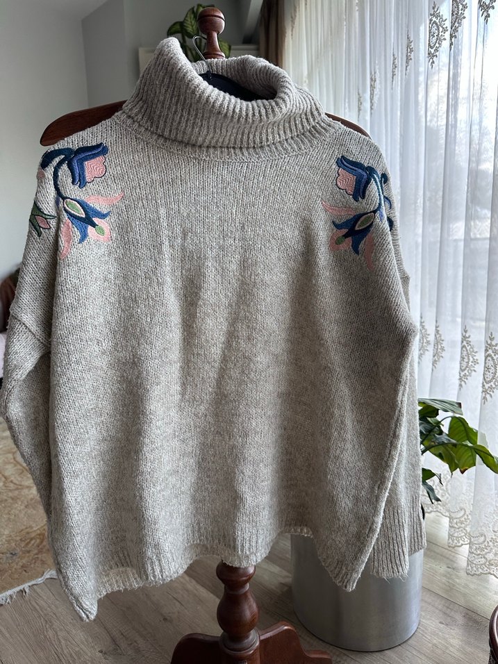 Gri renkte, bol kesim triko kazak. Boğazlı yakası ve uzun kolları rahatlık sağlar. Omuzlardaki nakış detayları bohem tarzı yansıtır. Boy: 60 cm Kol: 87cm