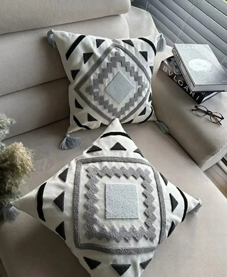 Bohem tarzda, gri tonlarda nakışlı geometrik desenlere sahip dekoratif yastıklardır. Köşelerinde püsküller bulunur ve mekana şıklık katar. ️
