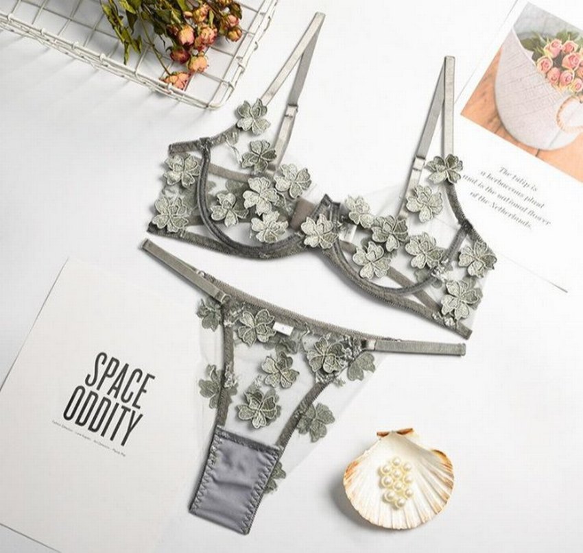 Gri renkte, nakışlı çiçek detaylı, bohem tarzda sütyen ve külot takımı. Normal boyda ve Paris esintili bir tasarıma sahip.