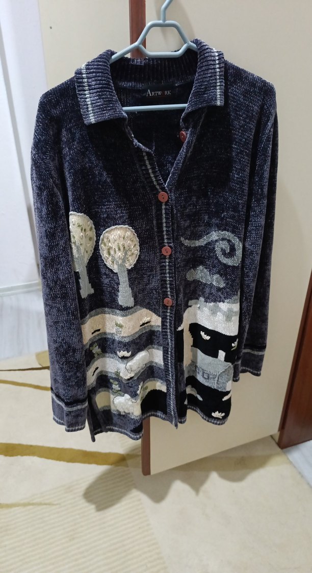 Gri renkli, uzun kollu triko hamile hırka. Bohem nakış detaylı, normal midi boyda, rahat kesim ve düğmeli yakaya sahip.