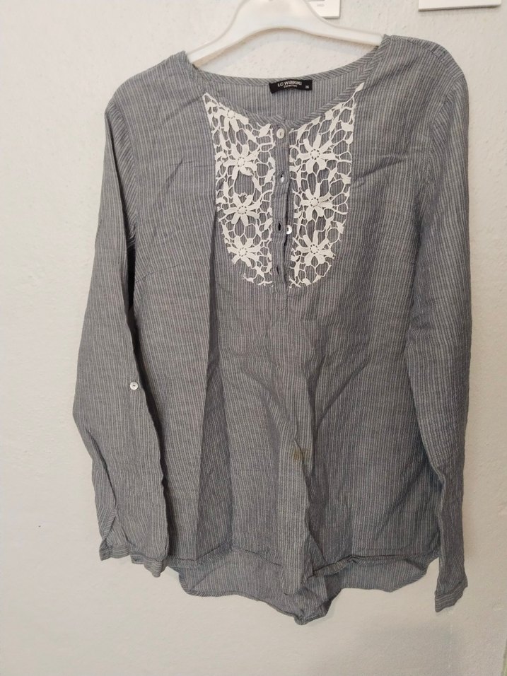 Bohem tarzda, gri keten kumaştan, uzun kollu, V yaka ve ön kısmında nakış detaylı, düğmeli, bol kesim kadın gömleği.