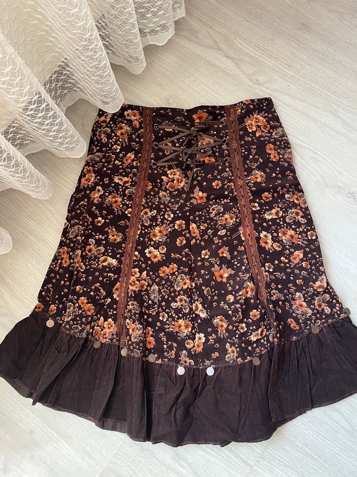 Nakışlı çiçek desenleri, fırfır detaylar ve bol kesimiyle kahverengi midi etek, bohem tarzı için uygun.
