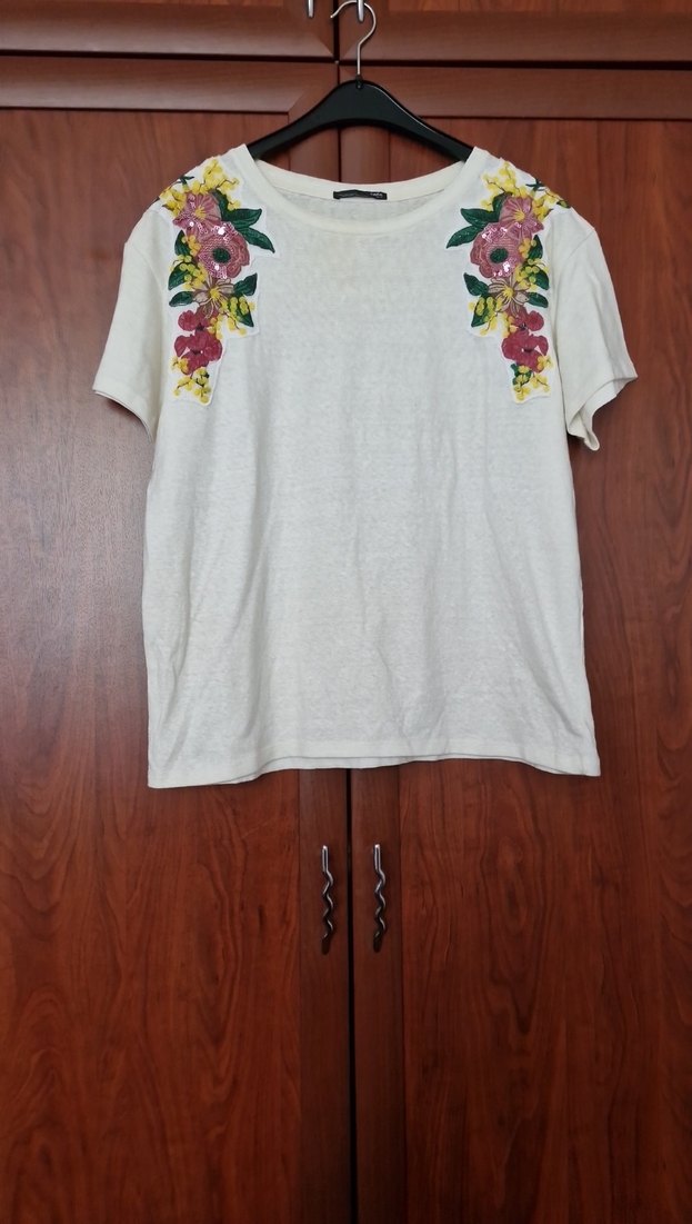 Pamuklu, kısa kollu, yuvarlak yakalı kadın bluz. Bohem tarzı nakışlı bol kesim, pastel krem renkli.