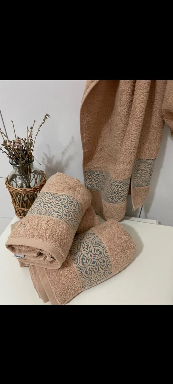 Bu kahverengi havlu üzerinde bohem tarzı gri nakışlı desenlerle süslenmiştir.