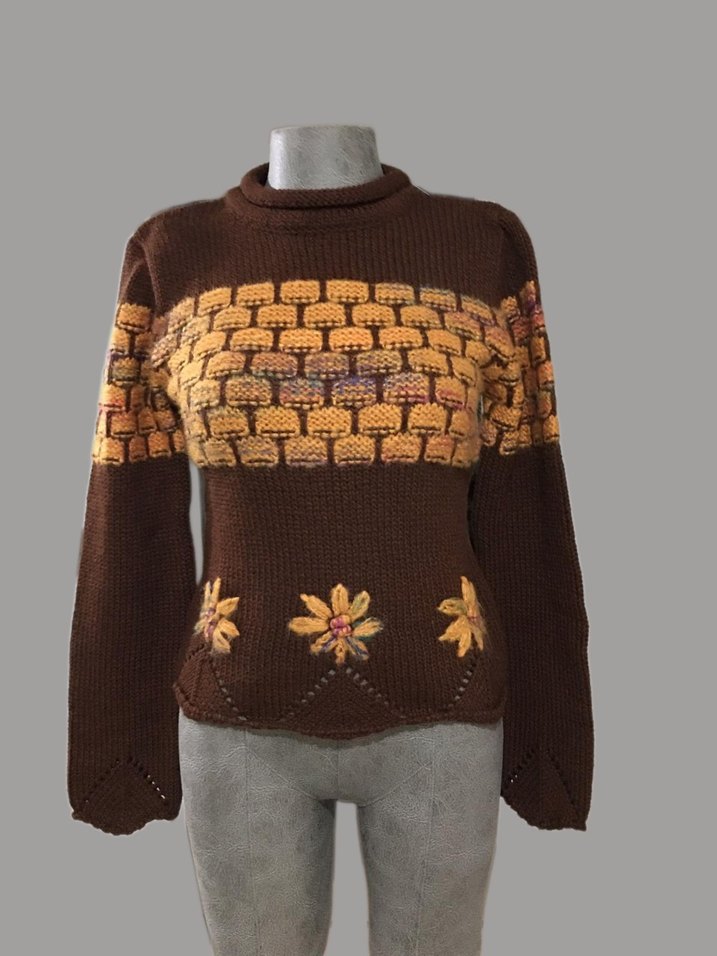 Kahverengi, nakışlı, kısa kesim, uzun kollu, bohem tarzda rahat bir örgü kazak.