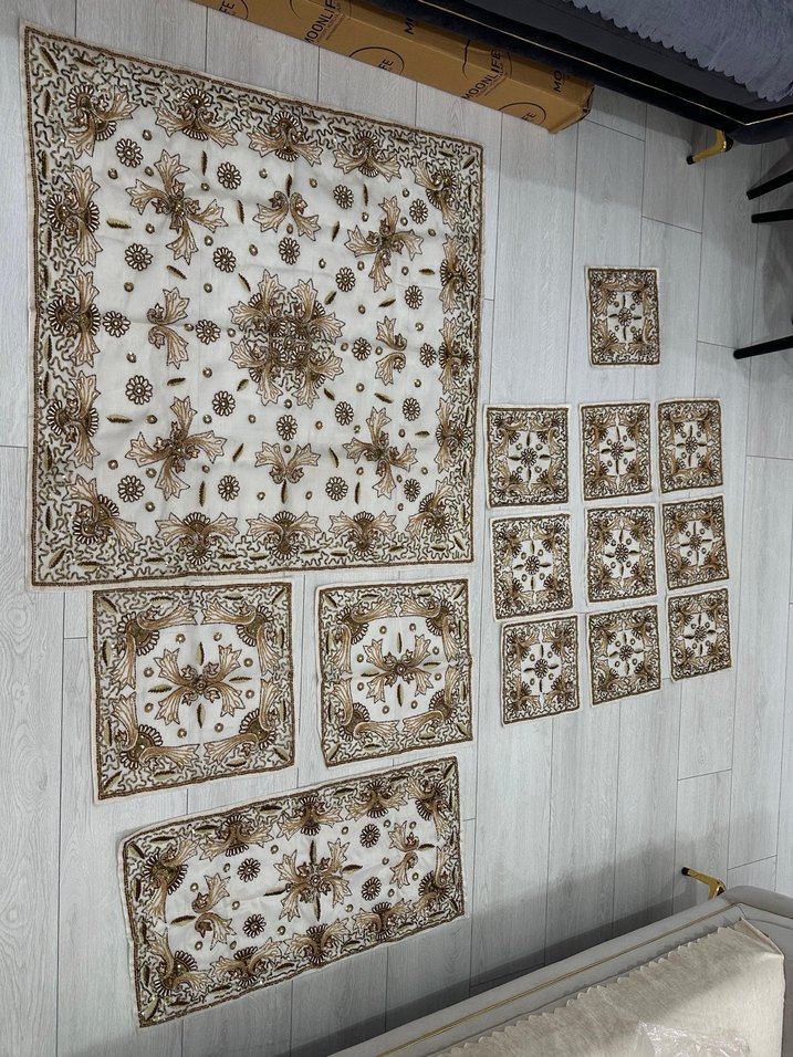 Nakışlı, açık kahverengi bohem desenli masa örtüsü ve uyumlu parçalar seti.