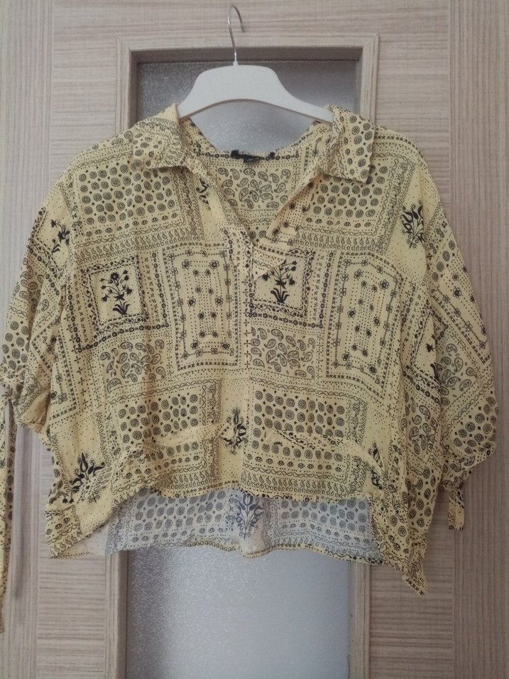 Bohem nakışlı, kısa kesim, bej renkli, düğmeli ve yakalı gömlek. Yumuşak dokulu kumaştan, günlük kullanım için uygun.