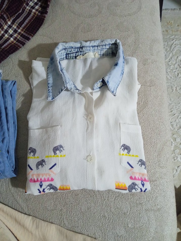 Bohem nakışlı, kısa boy, bol kesim kadın gömlek. Yakalı ve düğmeli, pastel beyaz renkte. Günlük kullanım için uygundur.