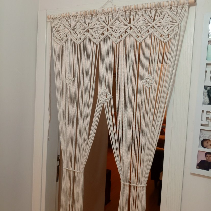 Bohem tarzda, beyaz ve gri tonlarda nakışlı, zarif makrome desenli perde.