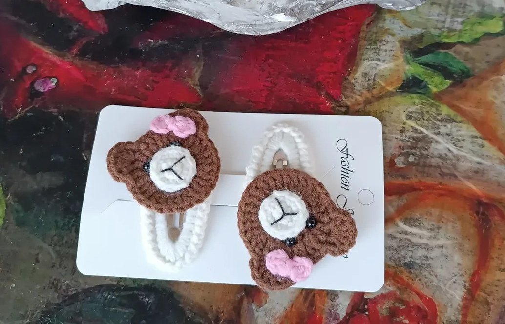 Kahverengi ve beyaz nakışlı ayı figürlü, pembe fiyonk detaylı örgü çocuk tokası seti. Bohem tarzda renkli tasarım. 5 cm çıt çıt üzerine örülmüştür .Çift fiyatıdır