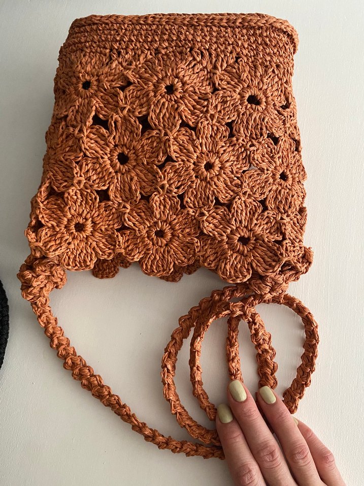 Bohem tarzda, çiçek dantel detaylı, kireit renkli örgü kadın çanta. Örgü askısı ile doğal bir görünüm sunar.