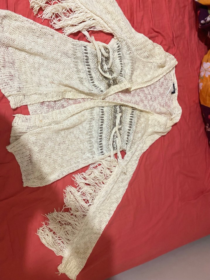 Örgü kumaştan, bol kesim, uzun kollu, V yaka kadın hırka. Nakış detaylı ve püsküllü, bohem tarzda, beyaz ve gri renkte, midi boyda, günlük kullanım için uygun.
