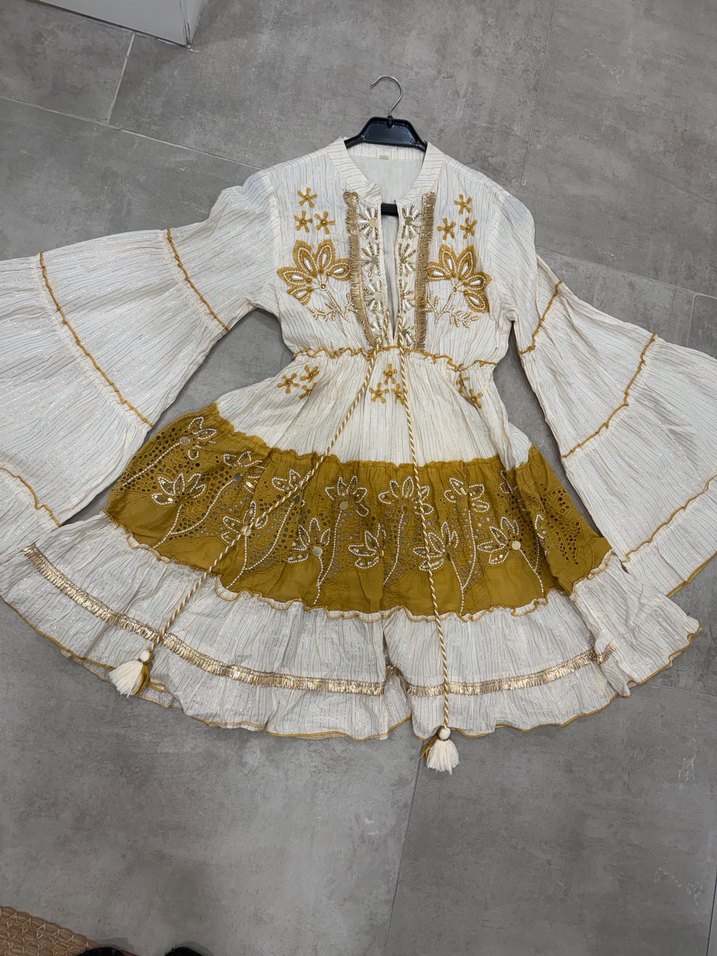 Bol kesim, uzun kollu, nakışlı ve püsküllü bohem mini elbise. Beyaz ve hardal tonlarında, düğünler için uygun. Yurt dışından aldım 1 defa kullanıldı