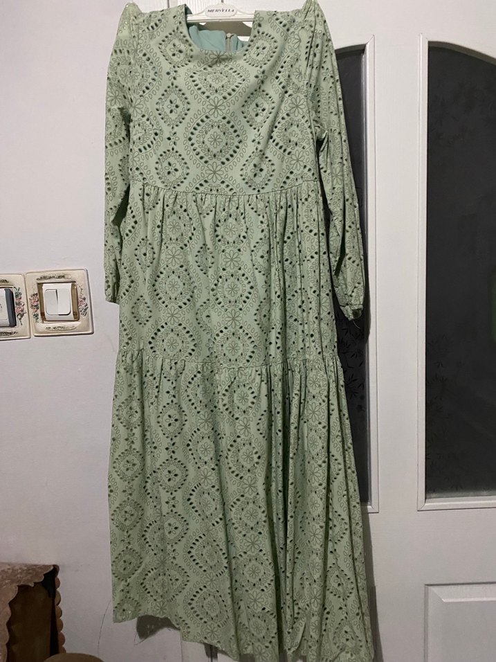 Yeşil renkte, nakışlı dantel kumaştan yapılmış, bol kesim ve yuvarlak yaka bohem tarz uzun elbise. Günlük kullanıma uygundur.
