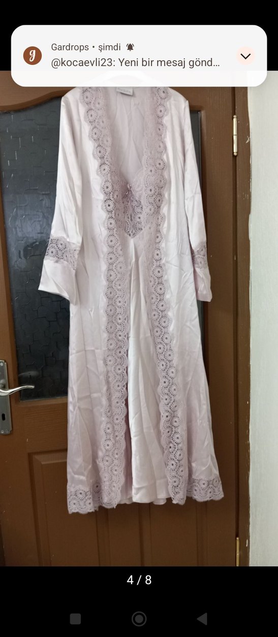 Uzun, bol kesim kadın sabahlık; pastel beyaz renkte, ön, kol ve etek ucunda nakış detaylarıyla bohem tarzını yansıtıyor. Uzun kollu, ferah tasarım.