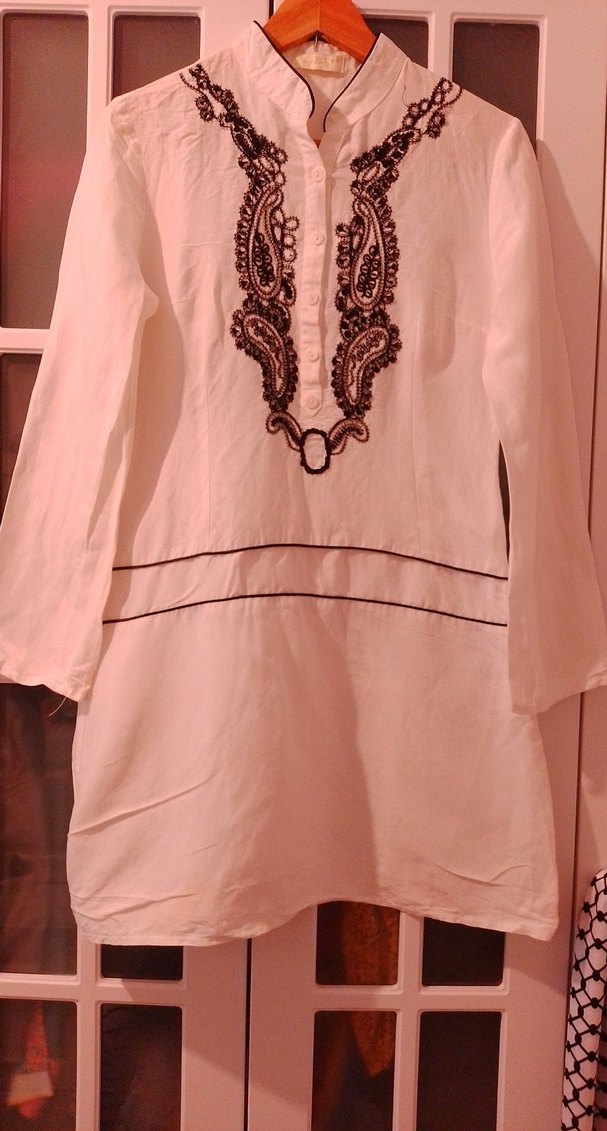 Bej renkli, bol kesim tunik uzun kollu ve bisiklet yakalı. Önde detaylı nakış ve düğmeler bulunur. Midi boyda, günlük kullanıma uygun yumuşak dokulu bir üründür. alt kısımda hafif bir lekesi var çekerken farkettim yıkanınca geçer gözükmüyor bile.