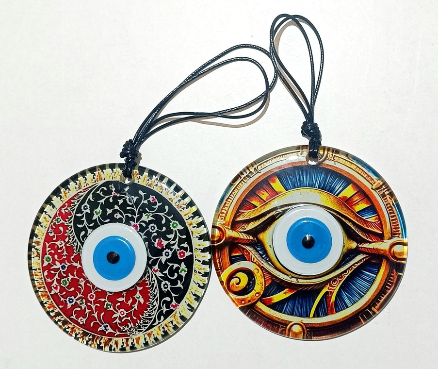 Bohem tarzda, büyük mavi nazar boncuğu desenli, ayrıntılı desenlere sahip duvar süsleri. Asmak için ipli.