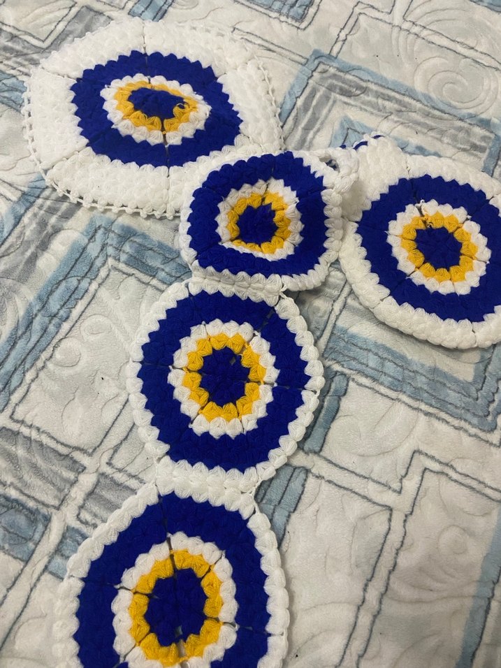 Beyaz, mavi ve sarı iplerle yapılmış bohem tarzda el örgüsü, nazar boncuklu dekoratif parça. Kültürel bir dokunuş sunar.