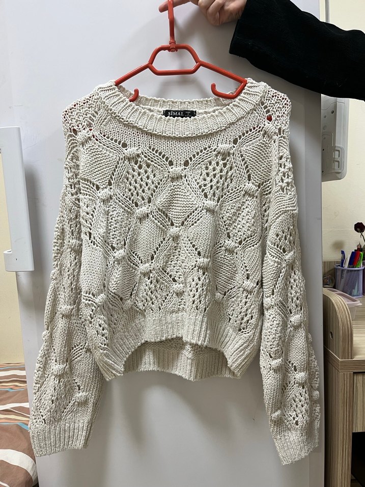 Beyaz renkli, örgü dokulu, bol kesim ve uzun kollu bohem tarzı kadın kazak. Günlük kullanıma uygun, rahat ve şık bir parça. Çok az giyildi kusuru yok