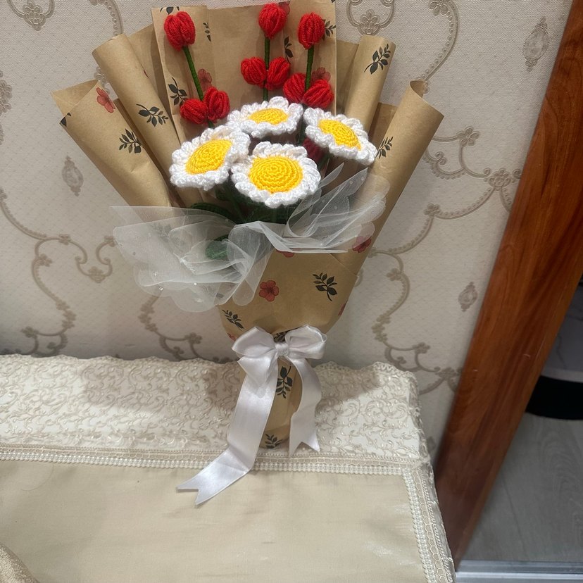 Beyaz yapraklı ve sarı merkezli el örgüsü çiçeklerden oluşan bohem tarzda buket, desenli kağıda sarılı ve beyaz kurdele ile bağlanmıştır.