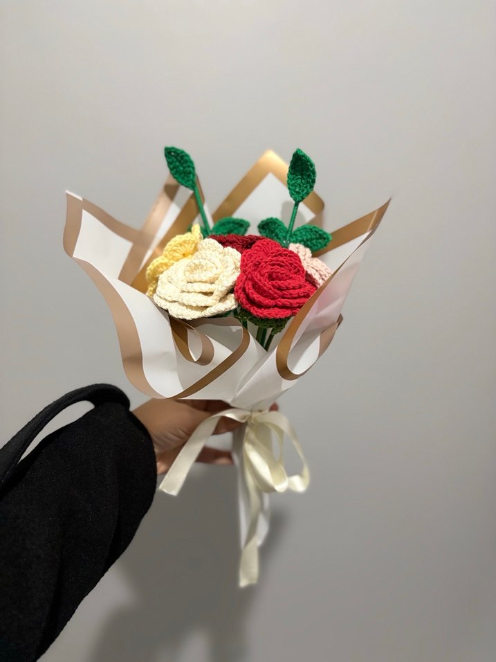 Kırmızı, krem ve sarı renklerde el örgüsü çiçeklerden oluşan, yeşil yapraklı bohem tarzda buket. Şık kağıt ve kurdele ile sarılmış.