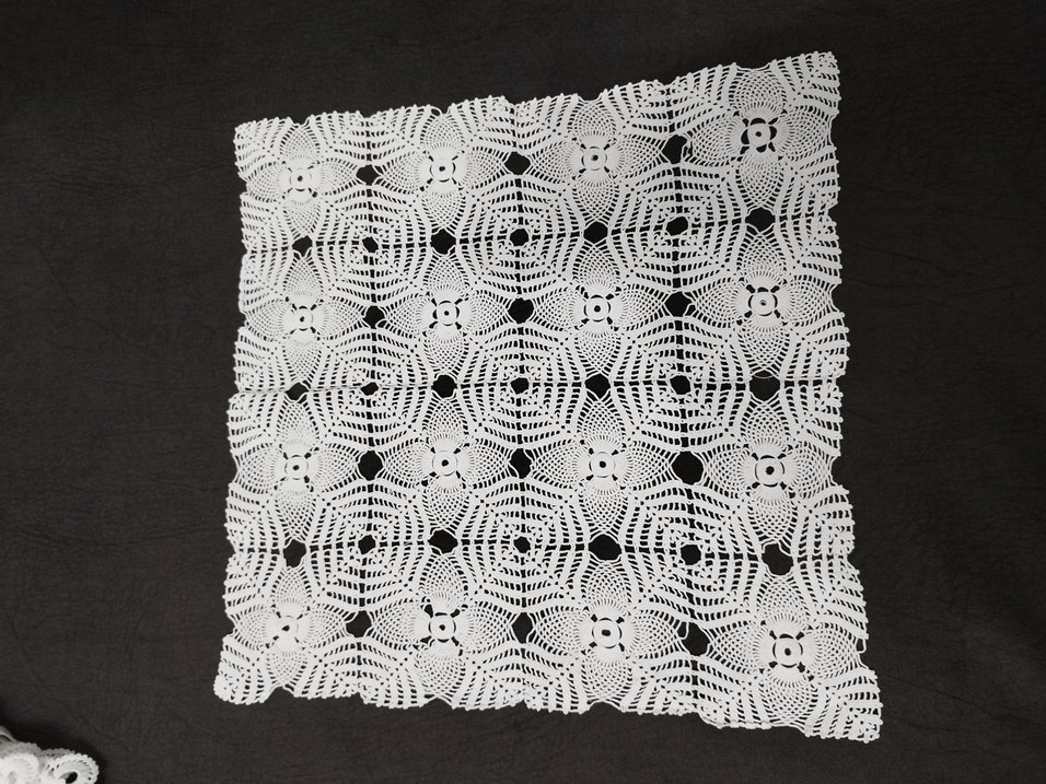 Bohem tarzda, beyaz renkli, ince işçilikle örülmüş örgü dantel masa örtüsü.
