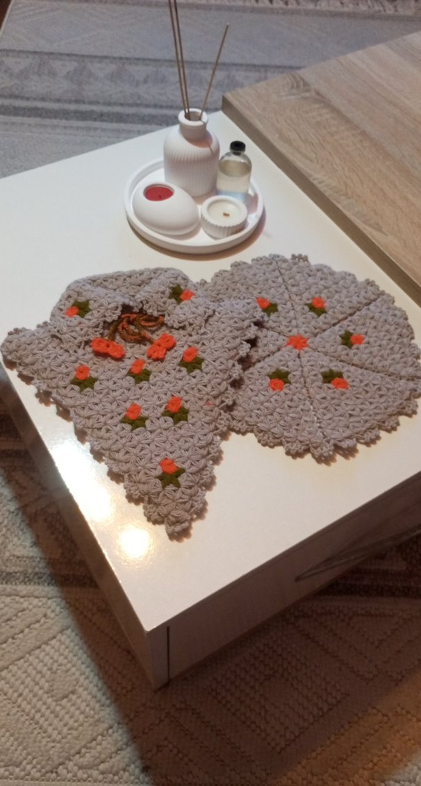 Bohem tarzda el işi örgü lif seti, küçük turuncu ve yeşil çiçek detaylarıyla süslenmiş yuvarlak ve kare parçalar içerir.