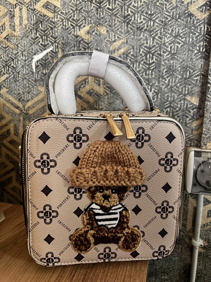 Kahverengi kadın çanta, örgü oyuncak ayı detayı ve baskılı örgü yüzeyi ile bohem ve retro tarzları günlük kullanım için birleştirir.