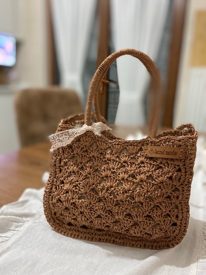 Kahverengi örgü kadın çanta, nakışlı desenler ve dantel detaylarıyla bohem tarzını yansıtır, günlük kullanıma uygundur. El emeğimdir