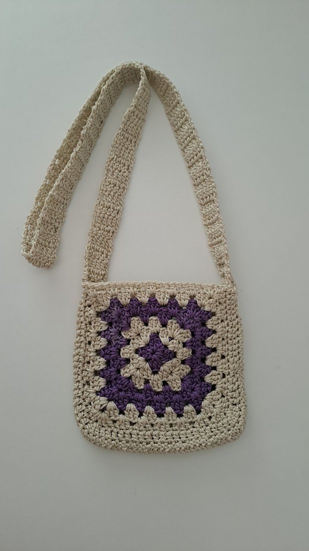 Hafif mor renkli, dantel detaylı örgü kadın çanta. Bohem tarzıyla günlük kullanıma uygun, desensiz ve hafif tasarım. mini boy el örgü