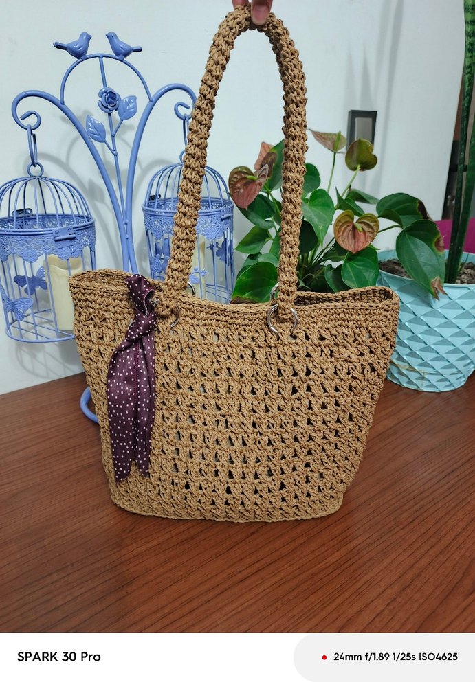 Hafif kahverengi örgü kadın çanta, kagıt ip hasır günlük kullanıma uygun bohem tarzda. Dokulu desene ve uzun saplara sahiptir.