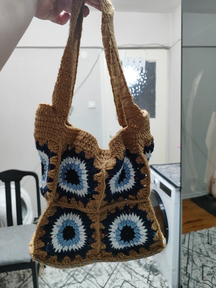 Kahverengi örgü kadın çanta, bohem tarzda desenli karelere sahip. Yumuşak örgü kumaşı günlük kullanıma uygundur.