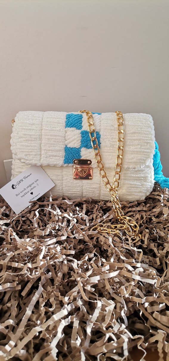 Beyaz örgü kadın çanta, hafif tie-dye desenli ve altın zincir saplı, bohem tarzda günlük kullanım için uygundur.