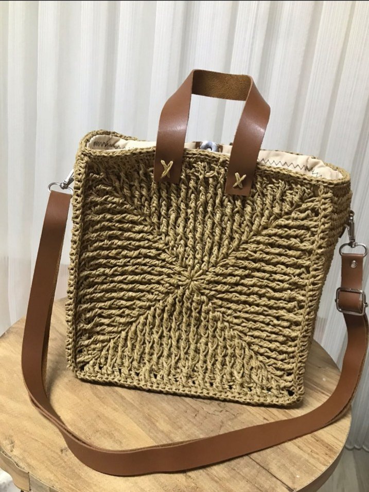 Bu kahverengi bohem kadın çantası, örgü dokusu ve dantel detaylarıyla deri saplara sahiptir. Günlük kullanım için hafif ve doğal bir görünüm sunar. Marka değildir. Kendim el emeğimle yaptım.
