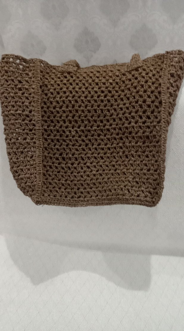 Kahverengi örgü kadın çanta, bohem tarzda, desensiz ve günlük kullanıma uygun rahat bir modeldir.